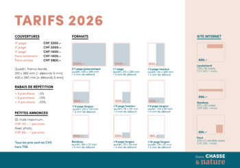 Contenu 25 mots maximum pour une parution dans une prochaine édition de la revue et sur ce site, CHF 40.– hors TVA uniquement texte – CHF 60.– hors TVA avec texte et photo. Commande et textes à transmettre à l’adresse: publicite@chassenature.ch.